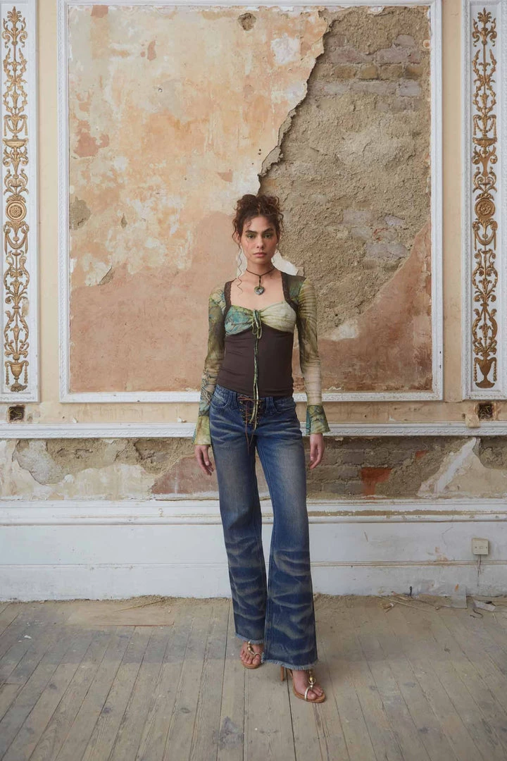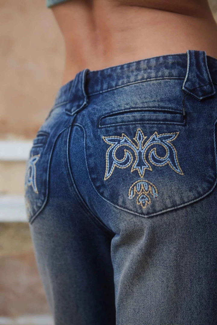 %text-1-start%Blue Low Rise Denim Boyfriend Fit Jeans With Spray Hem & Embellished Pocket Detail