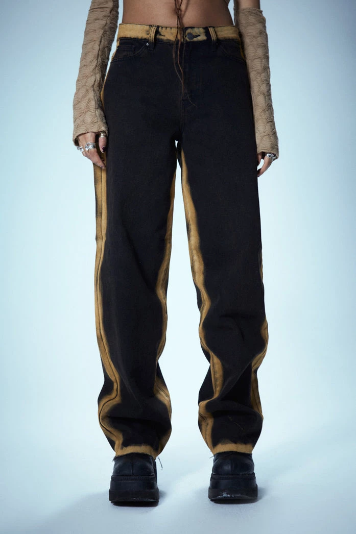 %text-1-start%Washed Black Low Rise Baggy Fit Jeans With Burnt Yellow Seams & Hem