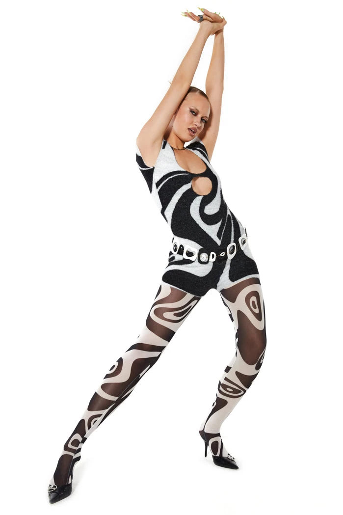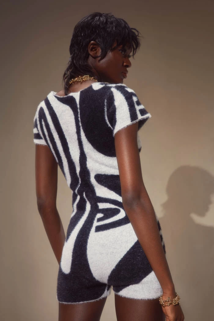 %text-1-start% Swirl Knit Mohair Romper in Black & White with Concealed Button Fastening