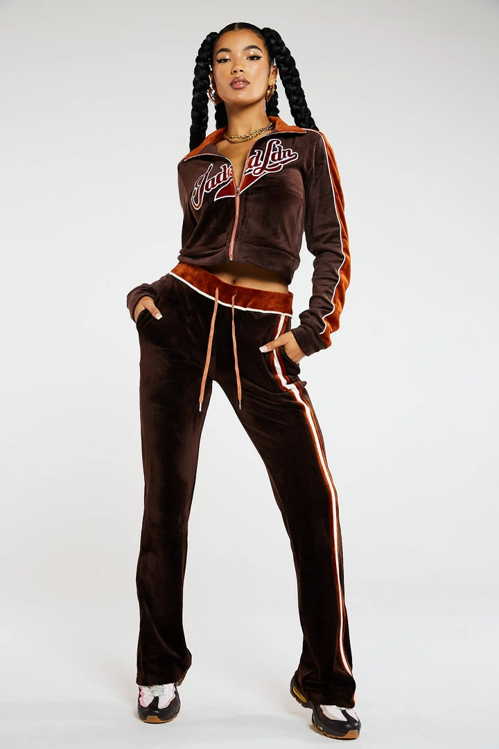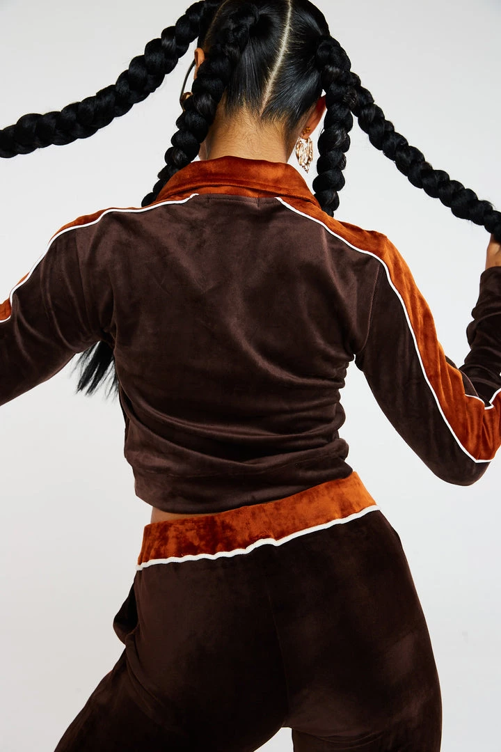 %text-1-start% Stand out this season rocking our Brown Zip Up Velour Jacket, pair with the matching joggers for a kick-ass co-ord!