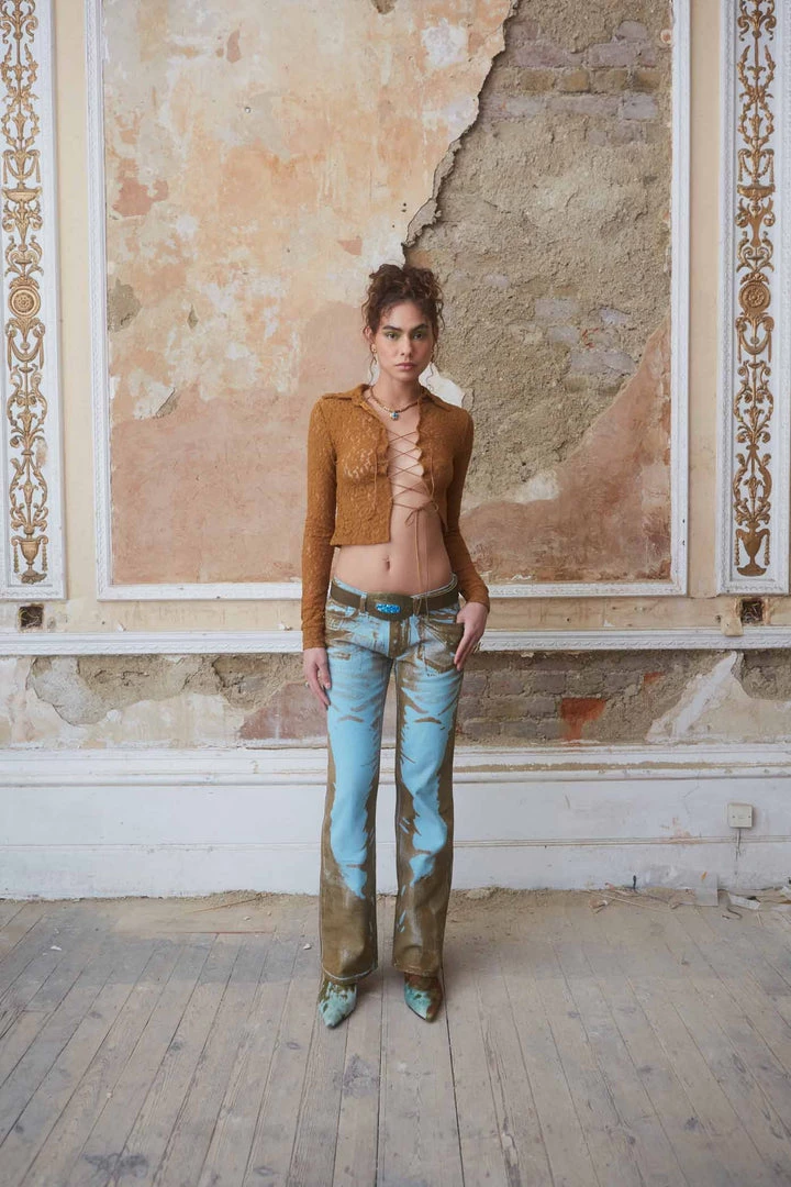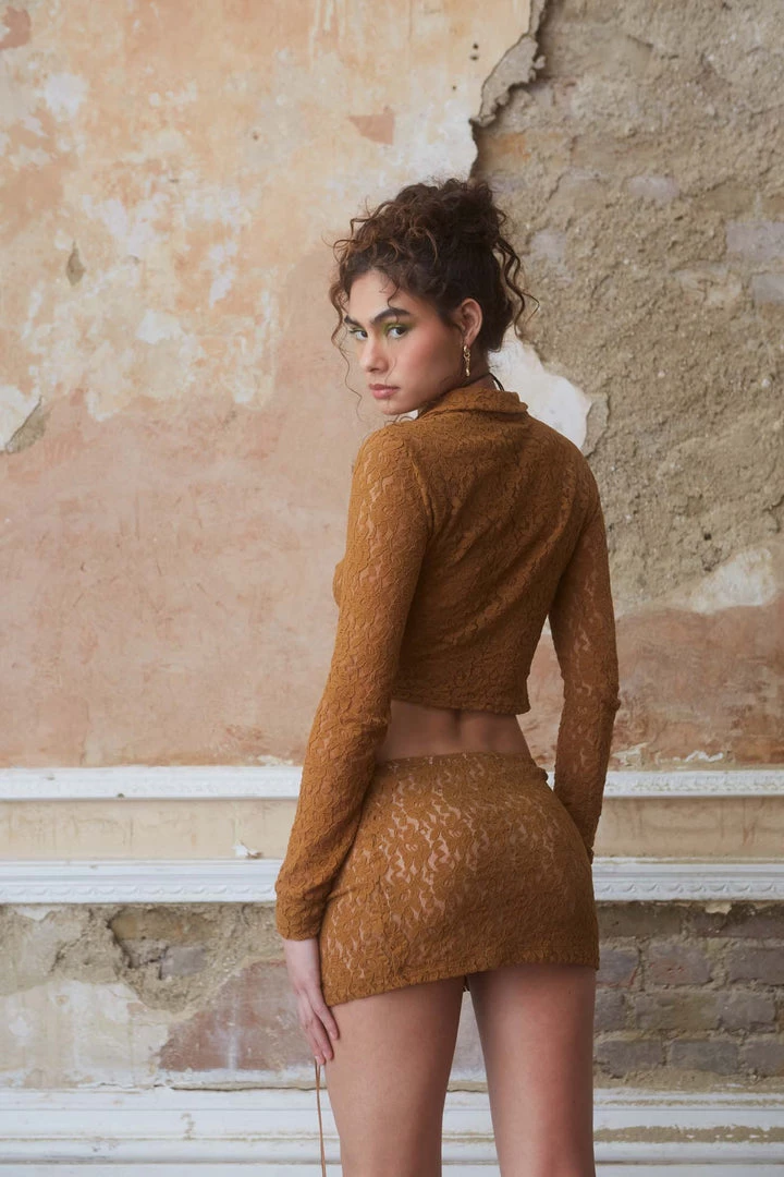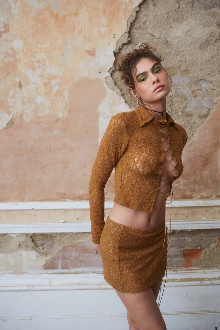 %text-1-start%Brown Lace Shirt With Extreme Lace Up DetailÂ