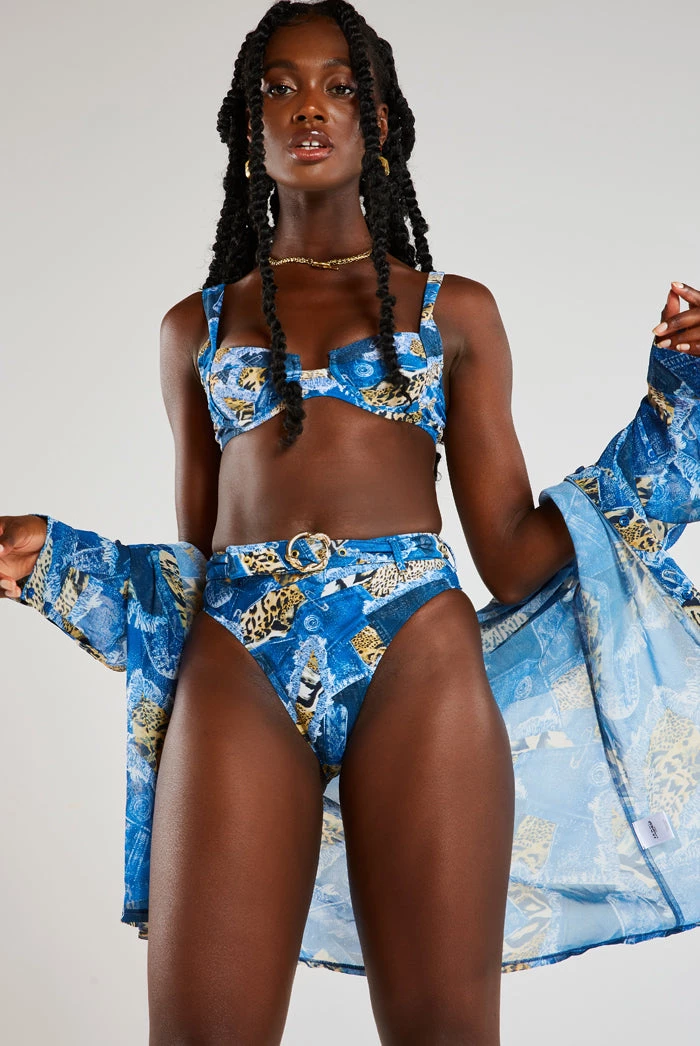 %text-1-start%Â Upgrade your swim wardrobe this season rocking our super cute Denim Patchwork Print High Waist Bikini Bottoms!