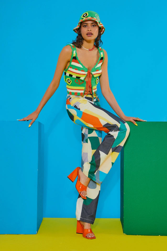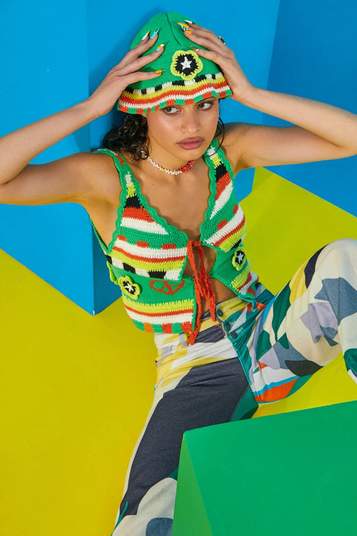 %text-1-start%Upgrade your wardrobe this season rocking our Green Retro Crochet Tie Front Cami Top!Â