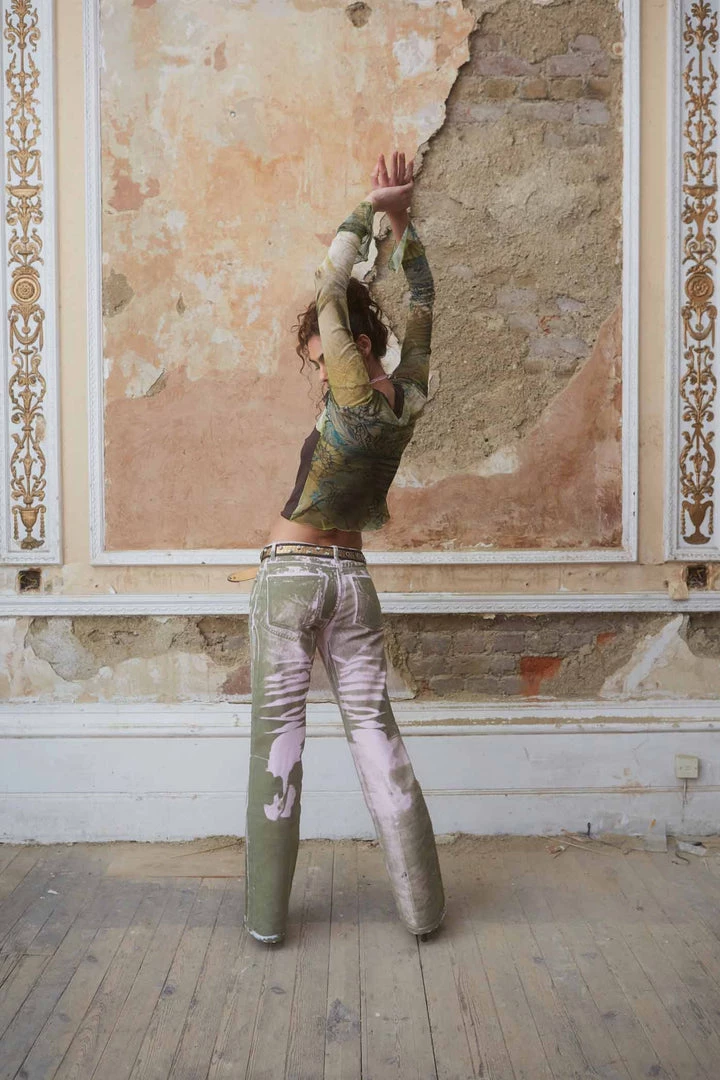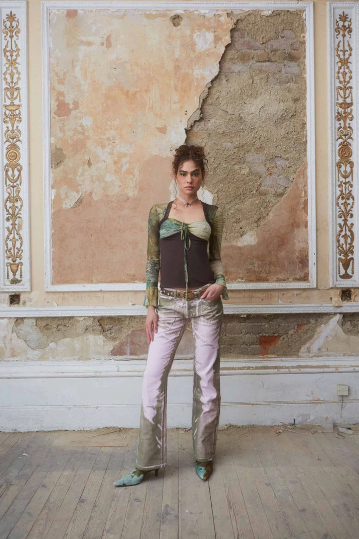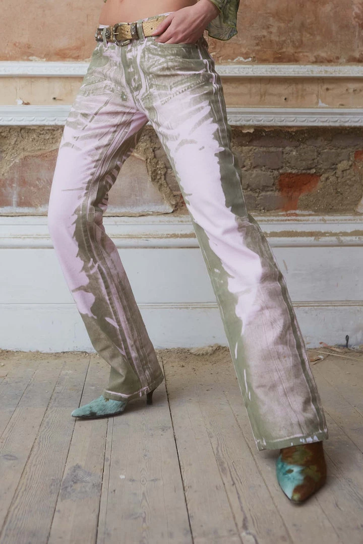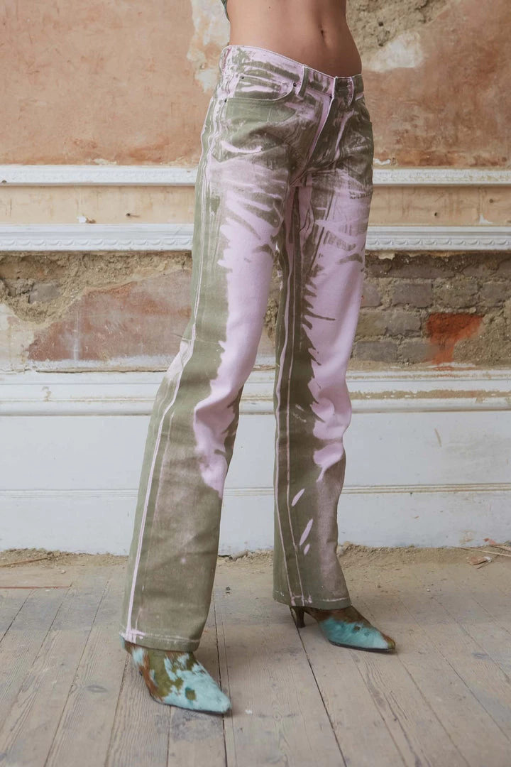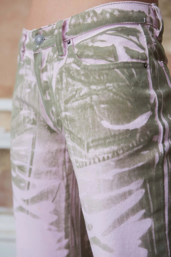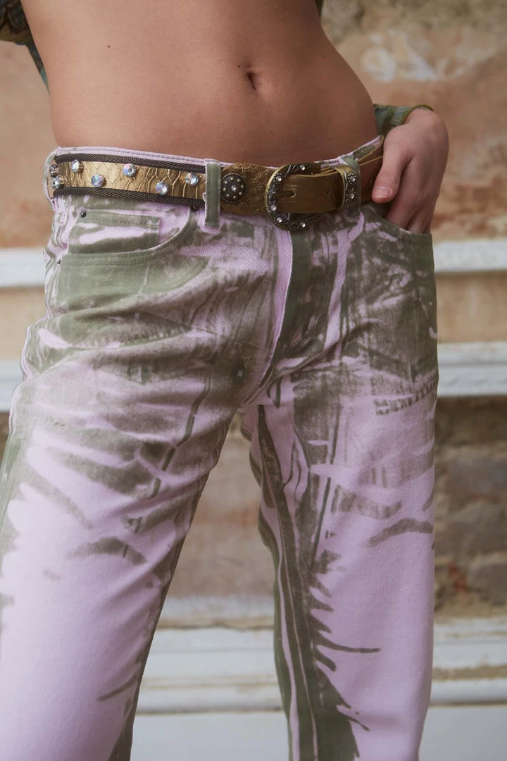 %text-1-start%Khaki & Pink Y2K Flock Placement Print Denim Jeans