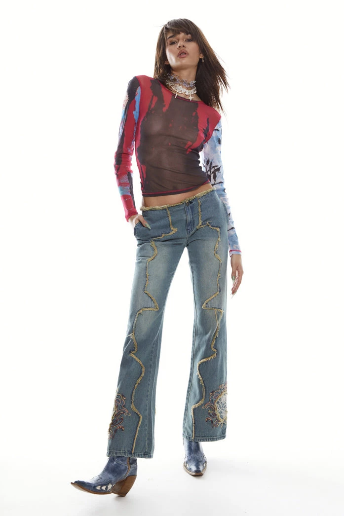 %text-1-start%Ripped Illusion Print Long Sleeve Semi-Sheer Mesh Top with Contrast Sleeves