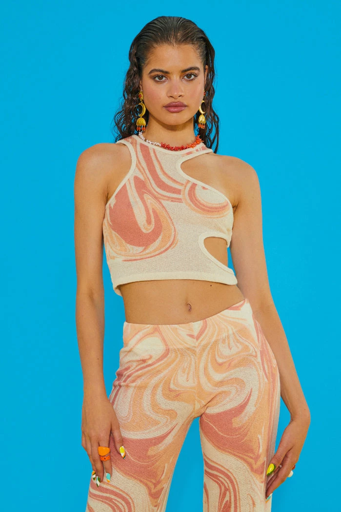 %text-1-start%Add some print to your wardrobe rocking our Orange Swirl Print Halter Cut Out Crop Top, style with the matching joggers for the ultimate co-ord!