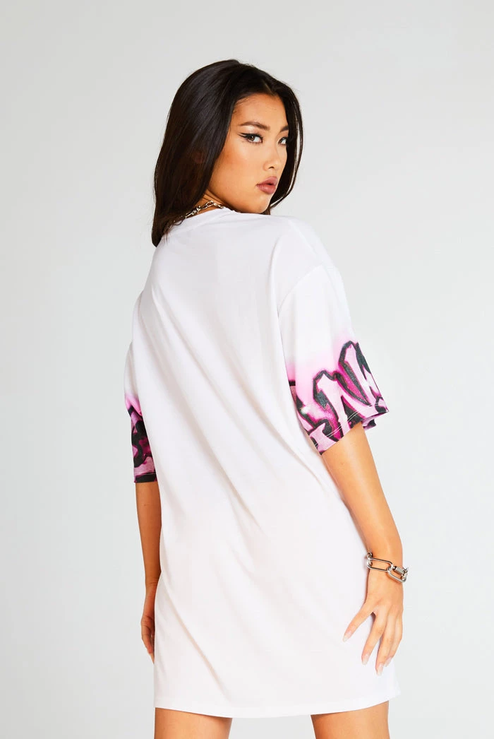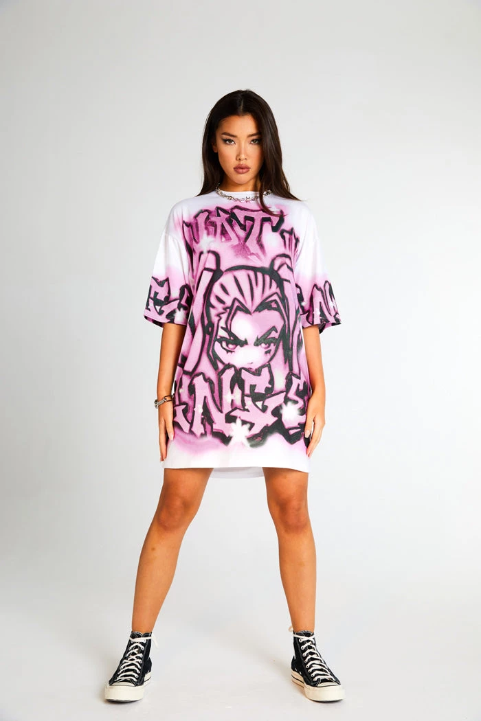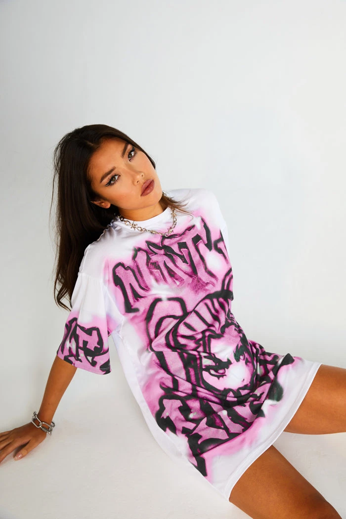 %text-1-start%Upgrade your wardrobe this season rocking our super cute pink not ur angel graffiti print oversized t-shirt dress!