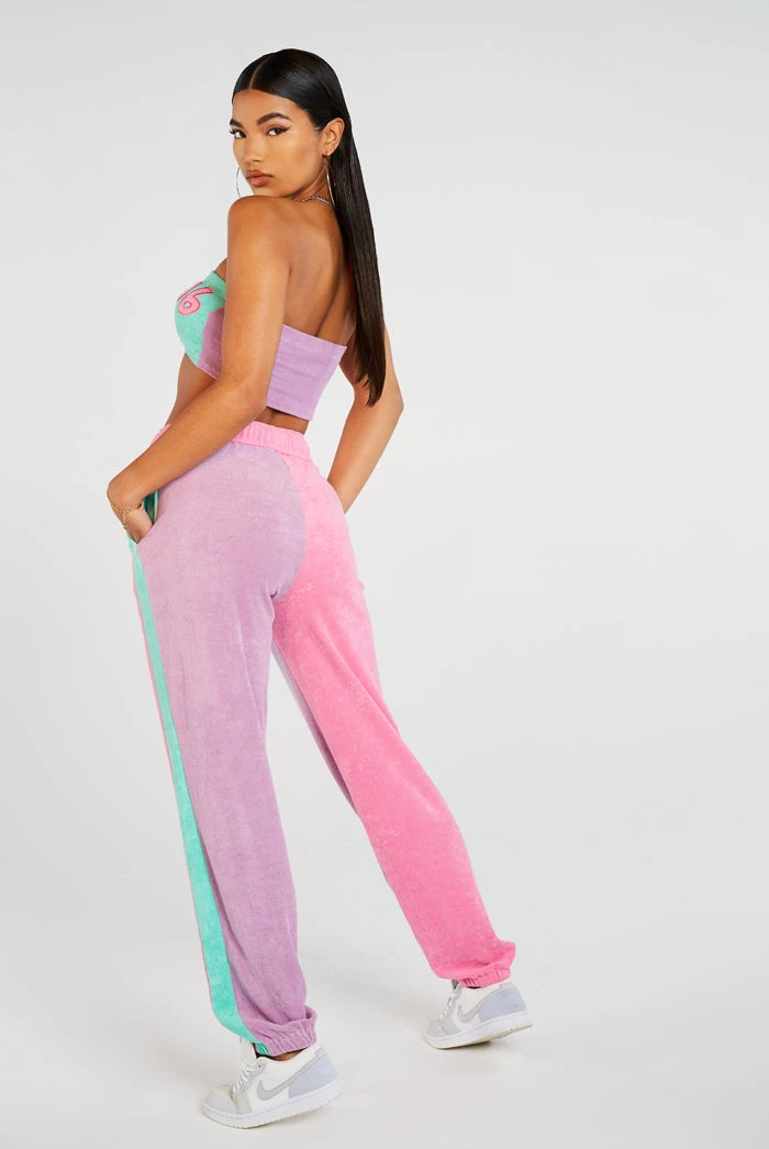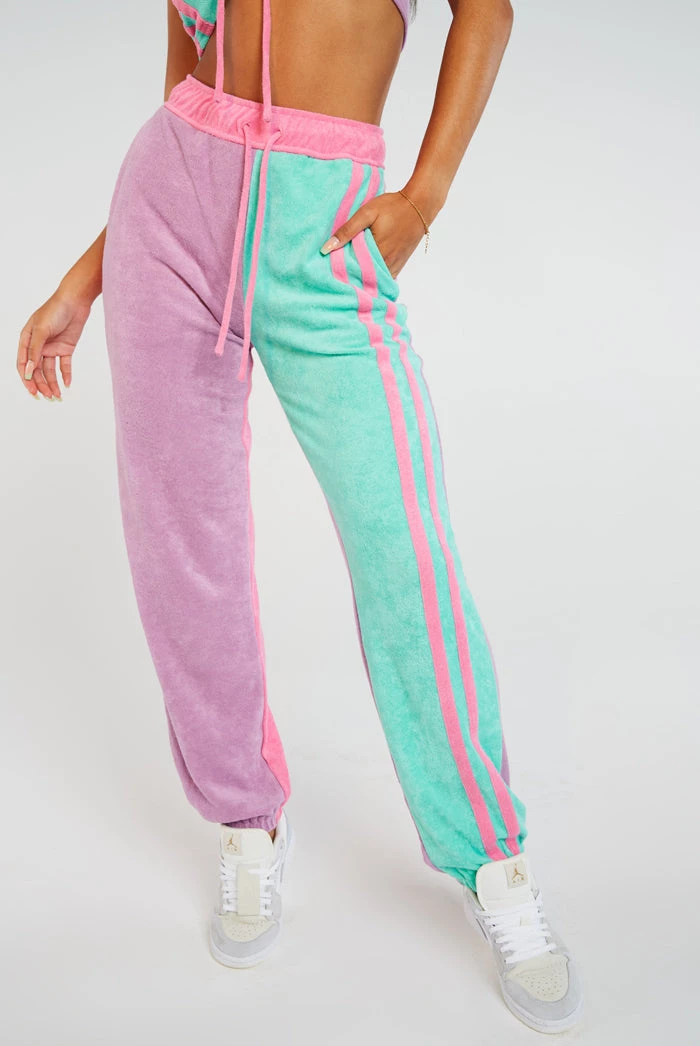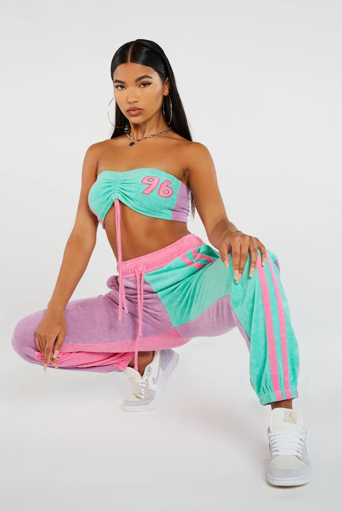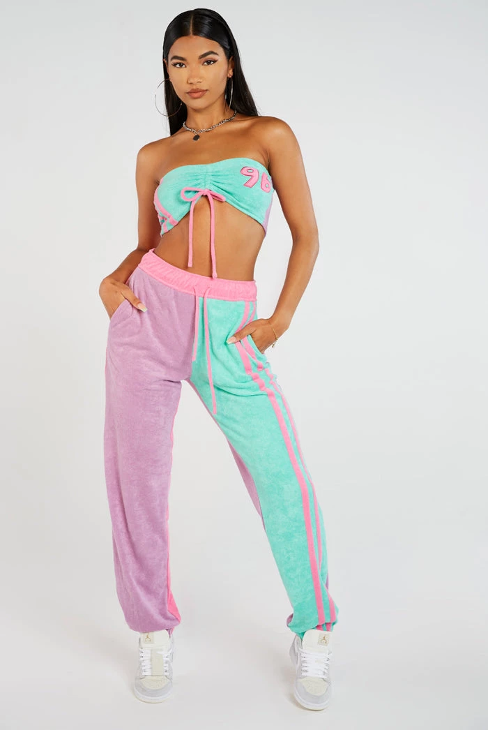 %text-1-start% Stand out in style this season rocking our super cute Purple & Turquoise Towelling Joggers, pair with the matching bandeau top for a kick-ass co-ord!