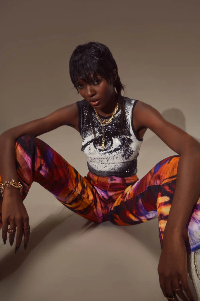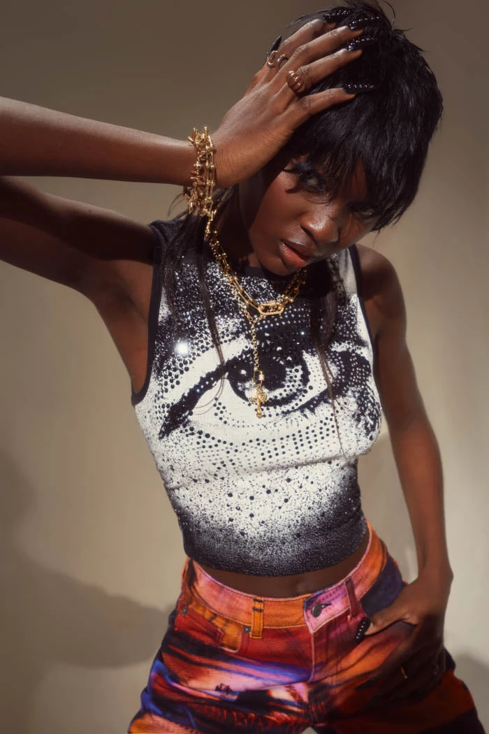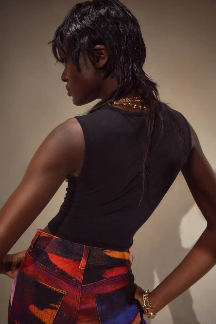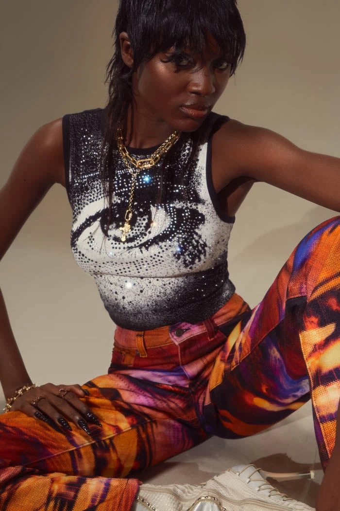 %text-1-start%Black Diamante Eye Print 00’s Jersey Vest Top With Contrast BindingÂ
