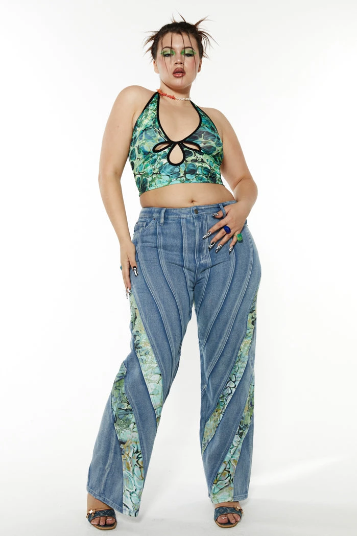 %text-1-start%Green Organism Print Thong Detail Warped Seam Jeans with Printed Panels