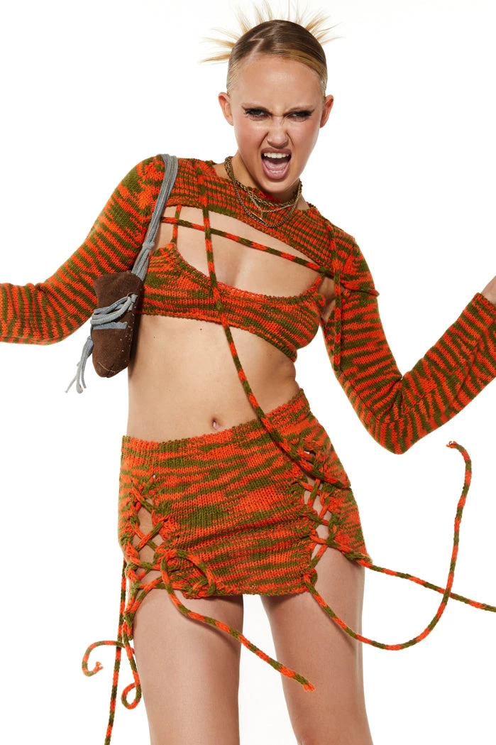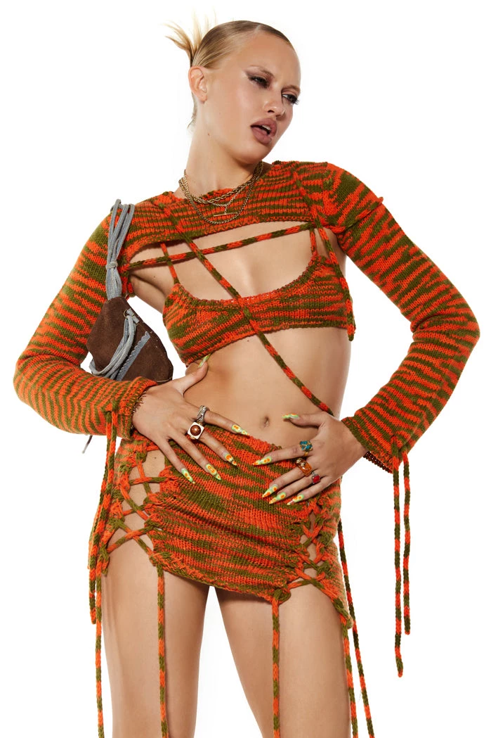 %text-1-start% Chunky Green & Orange Knit Lace Up Detail Mini SkirtÂ