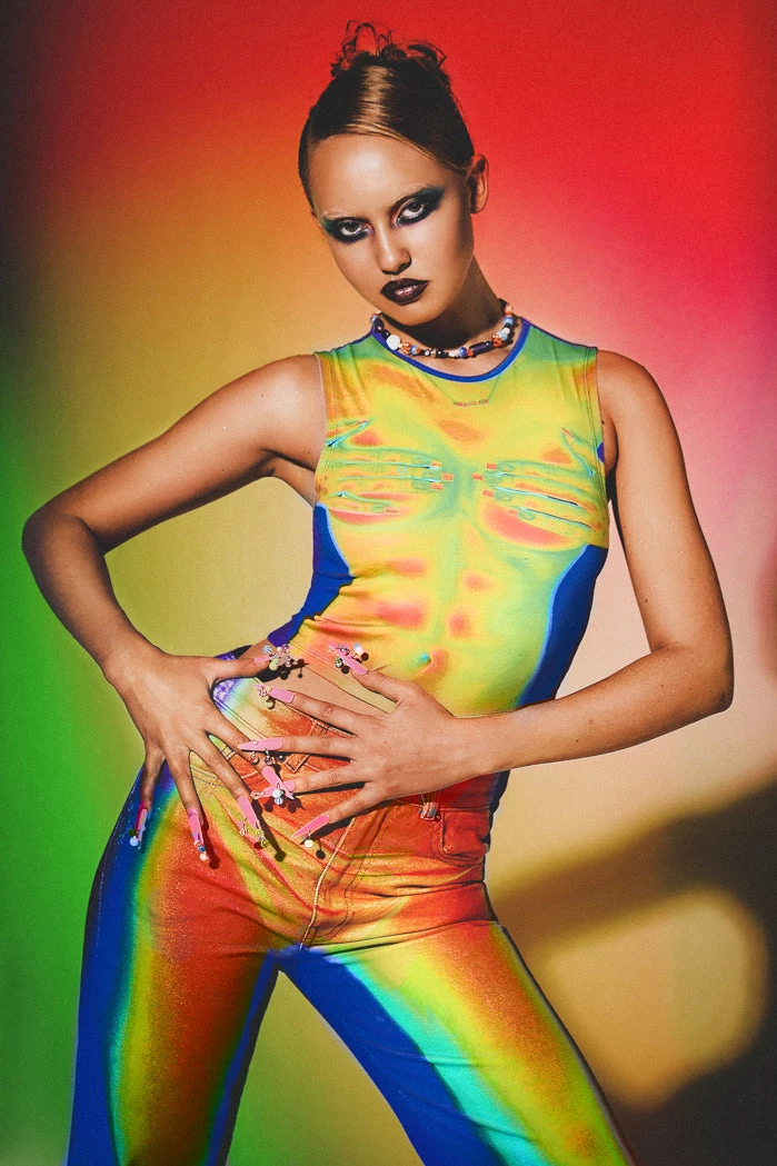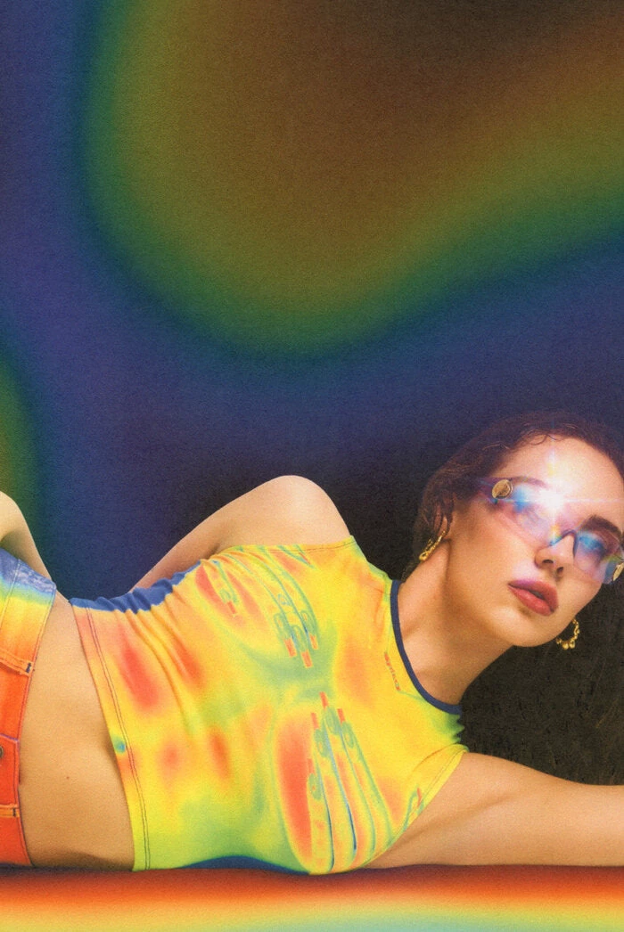 Inspired by the virtual world, the prints in the collection translate into all thing’s science lab. The drop includes thermal heatmap jeans and chemical inspired prints on some of Jaded’s iconic pieces. The pieces we have curated together feels authentic to Sydney’s style and her love for bright vintage prints.