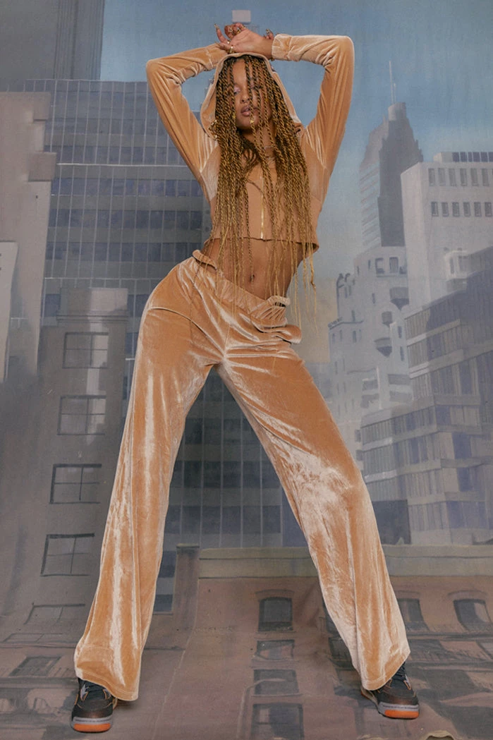 %text-1-start% Stay comfy in style this season rocking our Velour Low Rise Wide Leg Jogger with Thong & Embroidered Logo Detail. Style with the matching jacket!