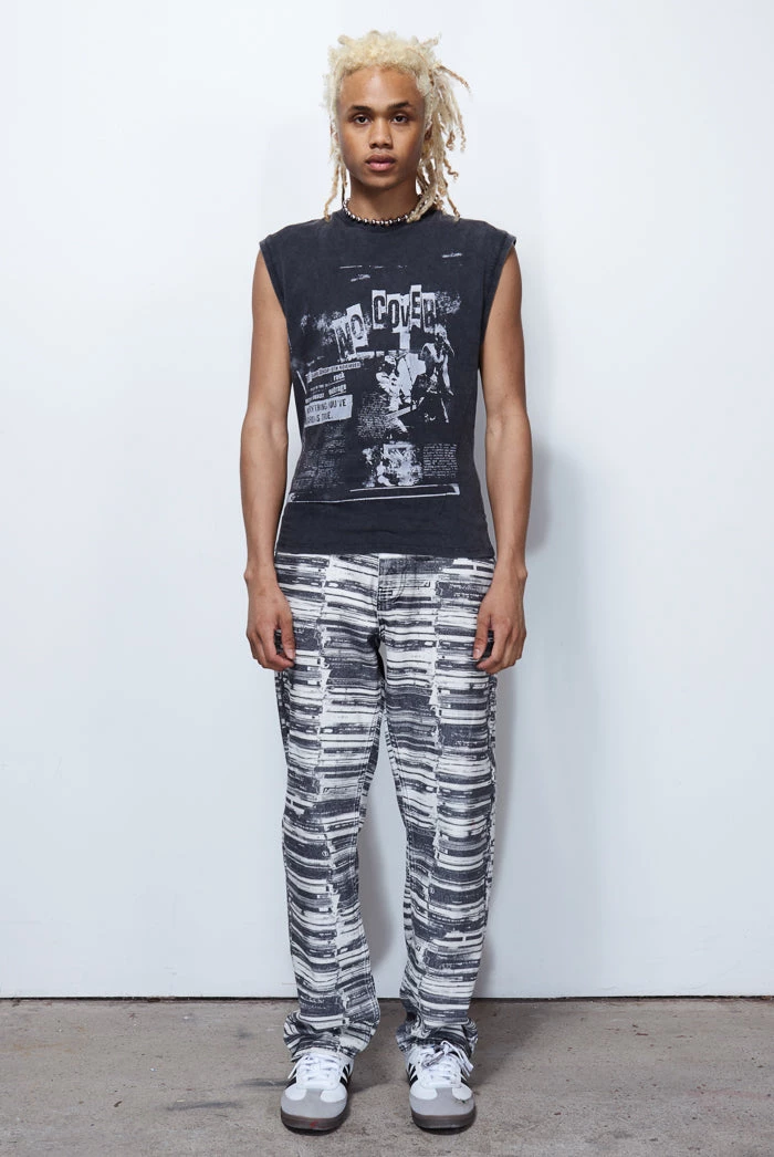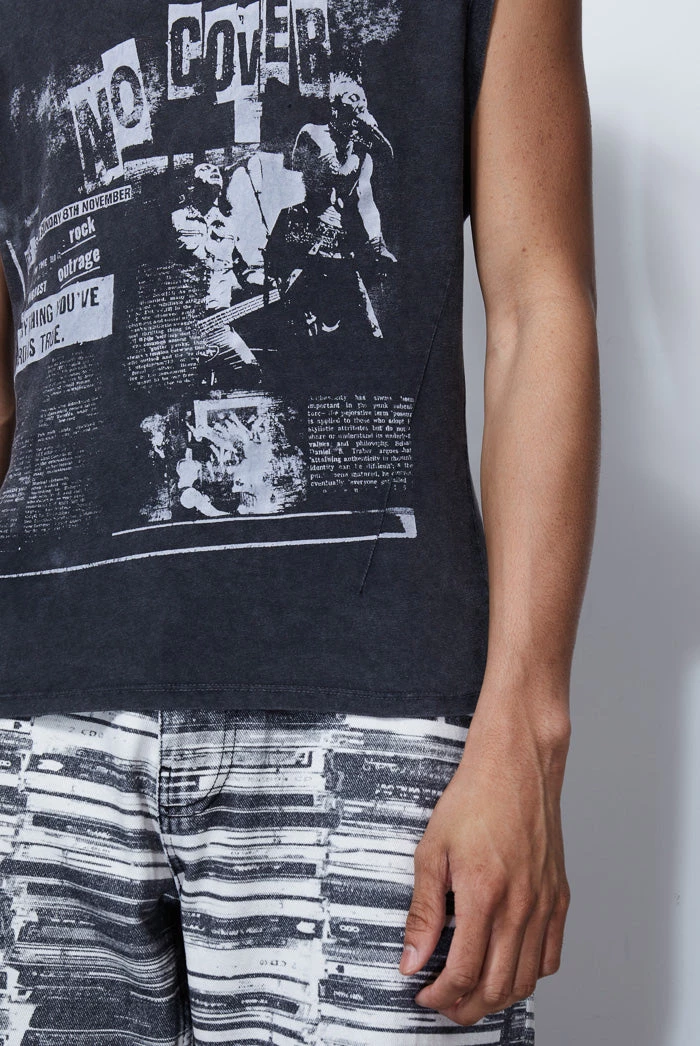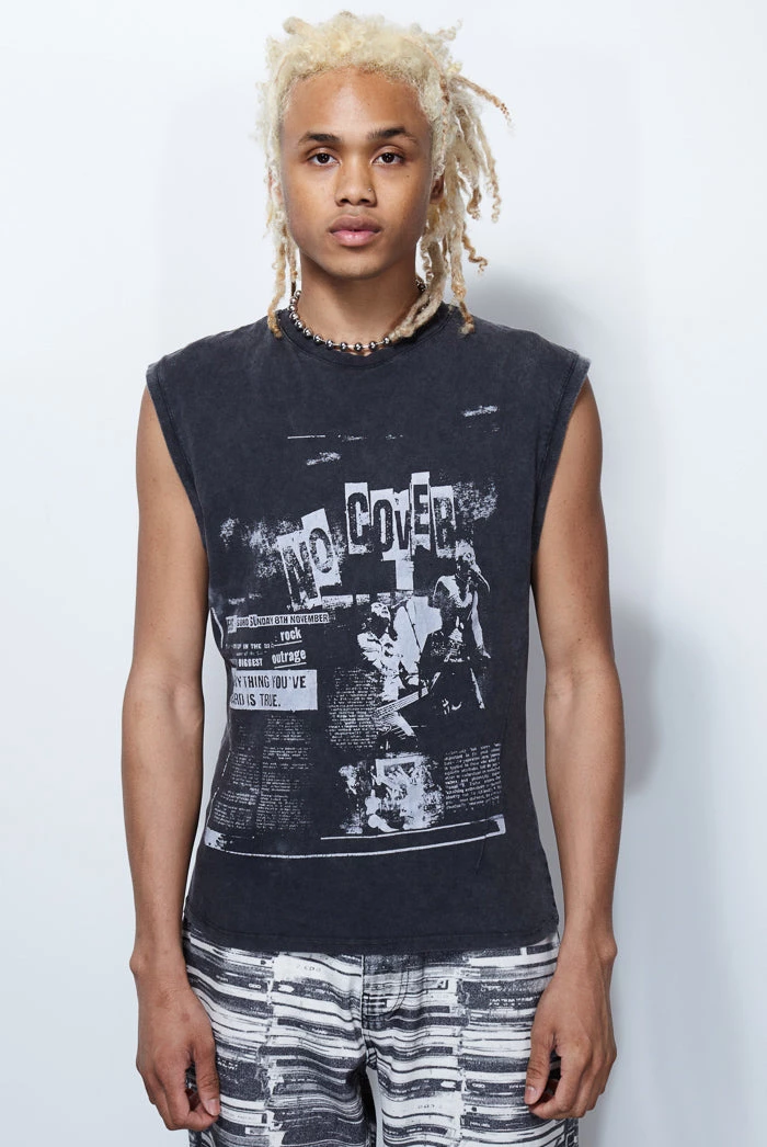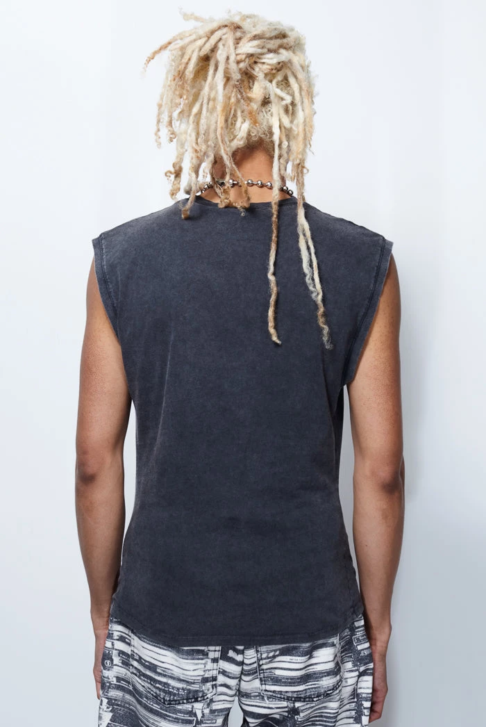 %text-1-start%Distressed Screen Print Vest with Acid Wash