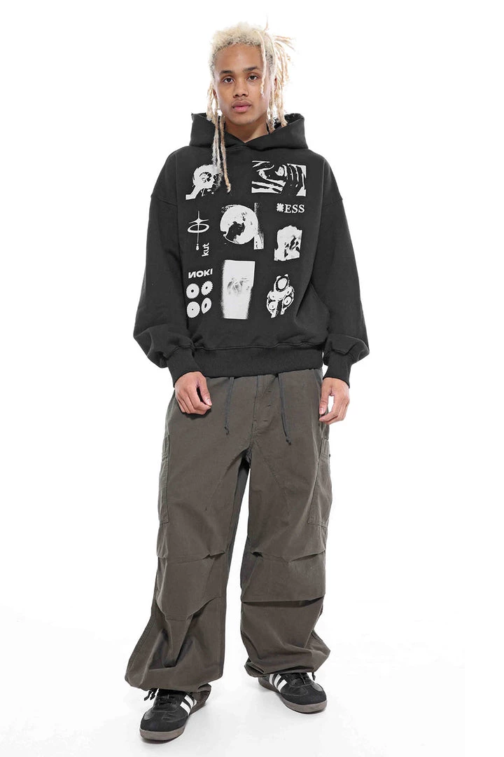 %text-1-start%Washed Black Punk Element Printed Hoodie