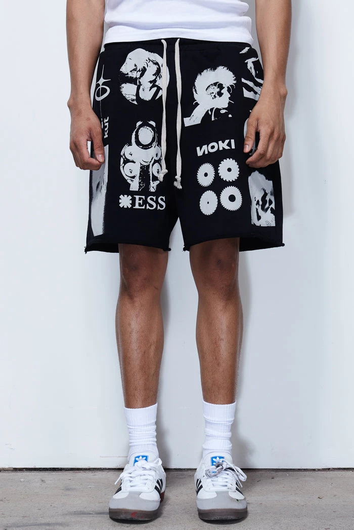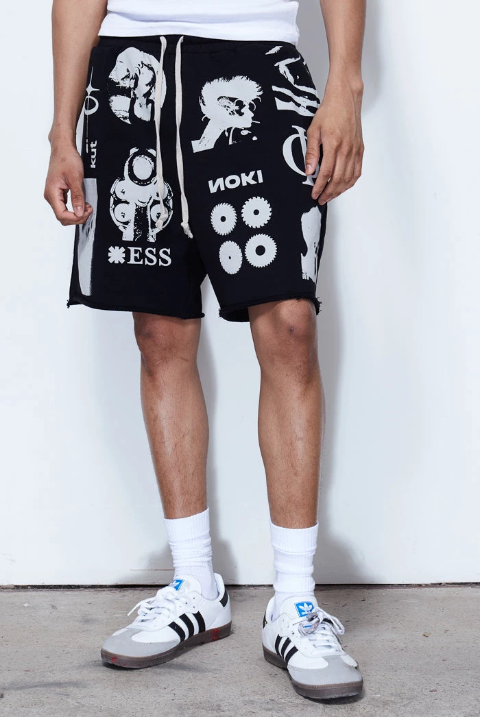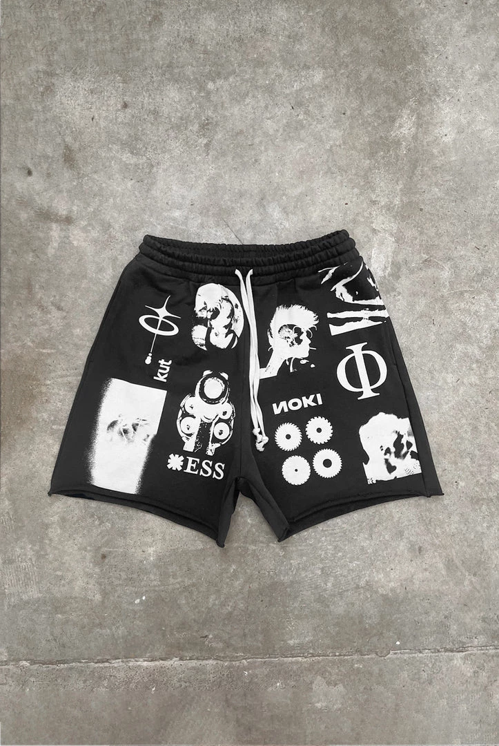 %text-1-start%Washed Black Punk Element Printed Drawstring Shorts
